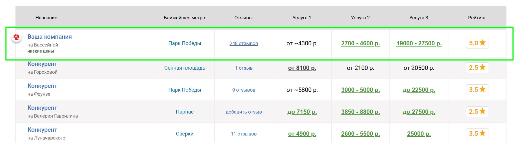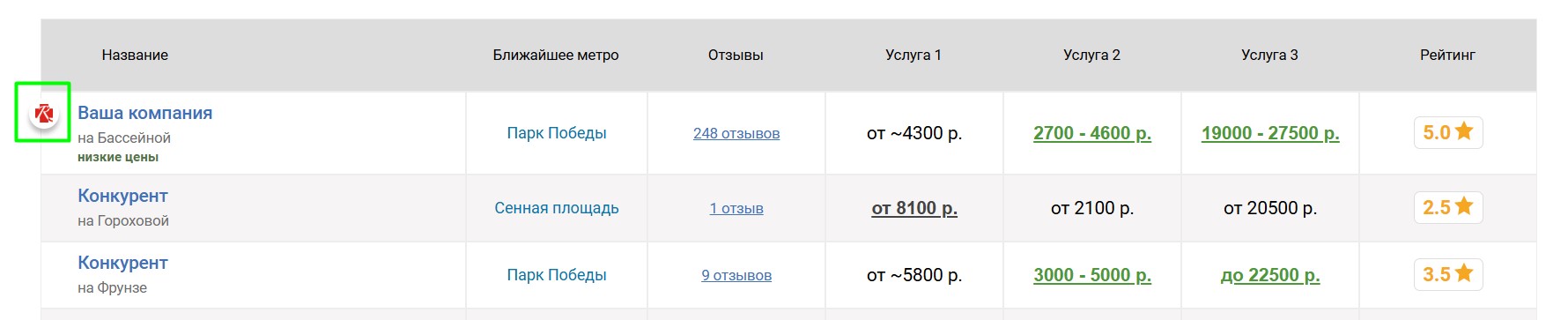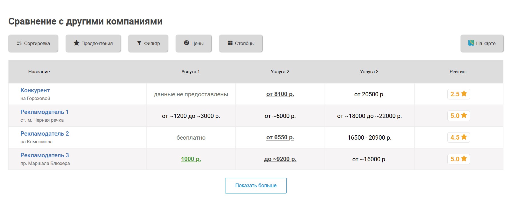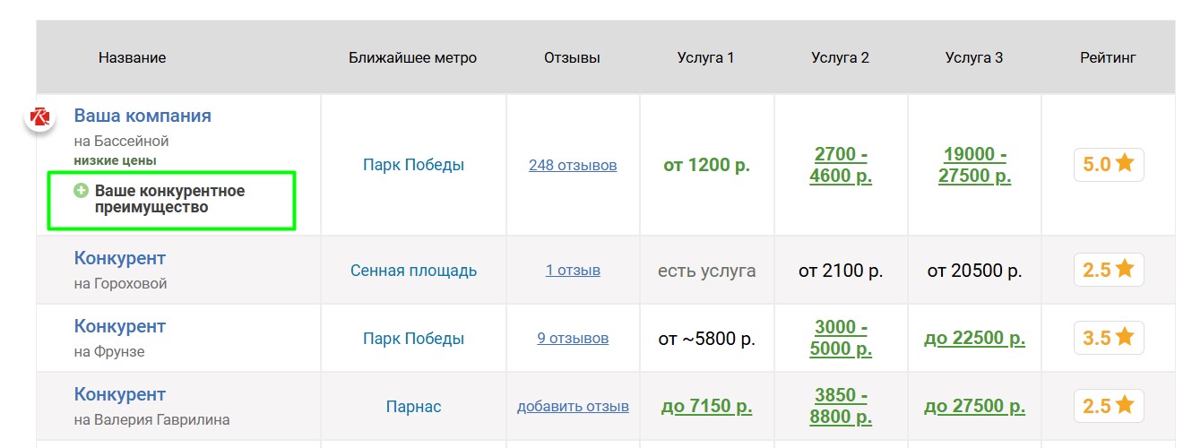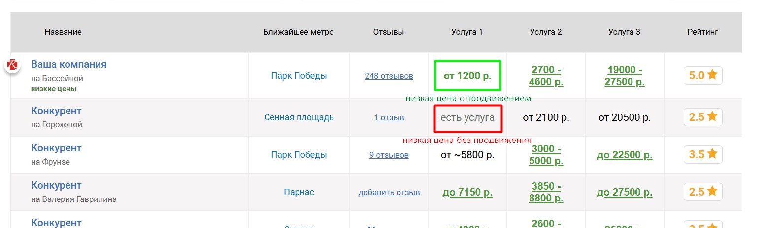 Вокруг продвигаемой таким образом компании выбирается некоторое количество ближайших конкурирующих компаний, продвигаемая компания попадёт к ним в таблицу «Сравнение по ценам», которая выглядит следующим образом: